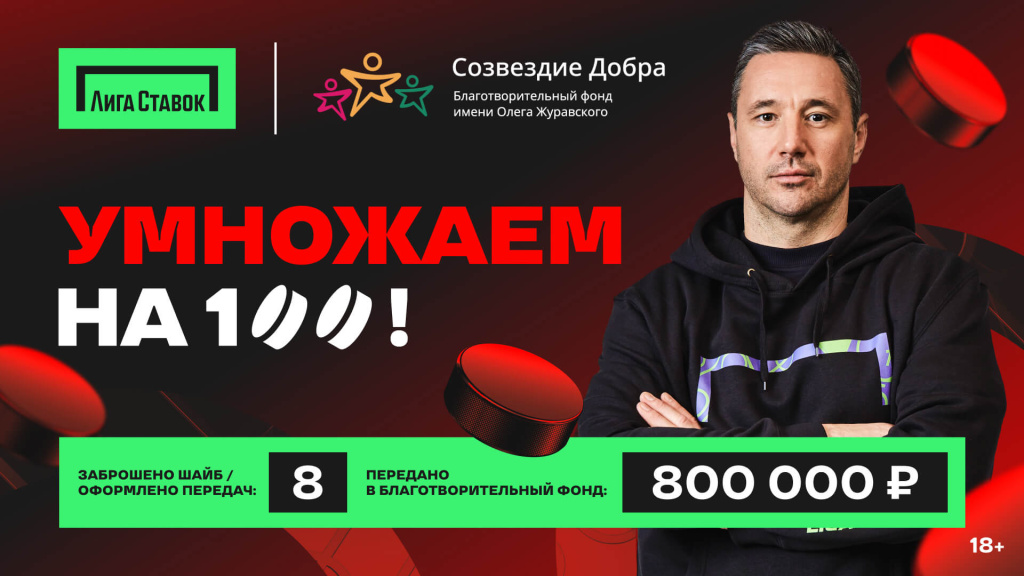 Благотворительная акция «Умножаем на 100», организованная «Лигой Ставок» в поддержку Фонда «Созвездие Добра», стартовала в декабре 2023 года и была приурочена к возобновлению игровой карьеры в составе ХК «Спартак» Ильи Ковальчука. За каждую заброшенную шайбу и голевую передачу Ильи в рамках чемпионата КХЛ сезона 2023/2024 компания перечисляет по 100 000 рублей в фонд.